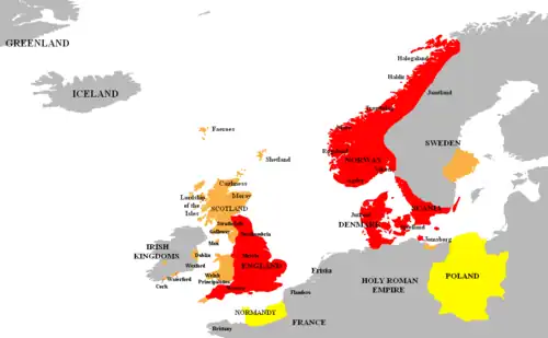 Wegen der Wikinger-Vergangenheit und durch die Ehe Knuts mit Emma von der Normandie galt die Normandie als verbündetes Herzogtum.