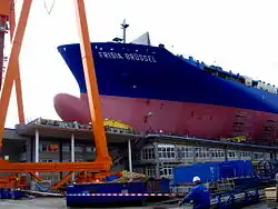 Nach 106 Jahren Schiffbau bei den Nordseewerken wurde am 11. Dezember 2009 der 228 Meter lange Containerfrachter Frisia Cottbus als letztes dort gebautes Schiff vom Stapel gelassen.[26]
