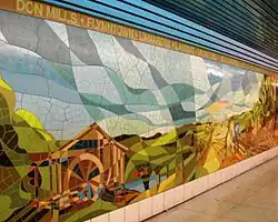 Beide Bahnsteige werden durch Wandbilder von Nicholas und Susana Graven verziert. Sie bestehen aus über 5.000 glasierten Keramikziegeln und stellen in abstrakter Weise Szenerien von North York im 19. Jahrhundert dar. Top of the North zeigt eine Mühle und Bauern in den 1850er Jahren, Traffic at Yonge and Sheppard den Postkutschen- und Pferdefuhrwerkverkehr in den 1860er Jahren.[3]