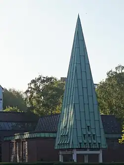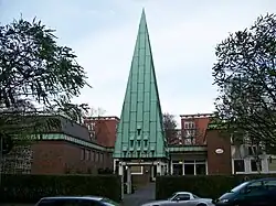 Die Kirche ist ein rechteckiger Backsteinbau mit in Beton gefassten Glasfenstern. Das Dach ist in Kupfer eingedeckt. An das Bauwerk schließen sich der Eingangstrakt und das Gemeindehaus an. Der freistehende, spitze Glockenturm ist ebenfalls kupfergedeckt und erhebt sich straßenseitig über dem Zugang. Im unteren Bereich hat er an jeder Seite neun Schallöffnungen.