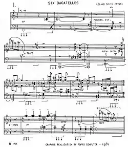 Zunächst wurden als Ausgabegeräte Stiftplotter eingesetzt. In diese Zeit fallen die 1971 veröffentlichten Sechs Bagatellen für Klavier von Leland Smith, die gemeinhin als erstes als Computersatz erschienenes Musikstück der Welt gelten.[3] Doch erst ab 1984, als die Seitenbeschreibungssprache PostScript entwickelt wurde und Laserdrucker günstiger wurden, setzten sich Notensatzprogramme im Verlagswesen durch. Mit der etwa zeitgleich erfolgten Veröffentlichung des MIDI-Standards (1982) wurde bessere akustische Wiedergabe der Noten möglich, zunächst jedoch für maximal acht Kanäle gleichzeitig. Erster Industriestandard für Notensatz wurde Score;[4] die Entwicklung begann bereits 1967, doch erst nach der offiziellen Veröffentlichung der Software 1989 wurde Score bei deutschen Verlagen nach und nach eingeführt.[5] Die erste für den Notensatz einsetzbare Software mit grafischer Benutzeroberfläche nach dem WYSIWYG-Prinzip stellen die 1988/1989 veröffentlichten Programme Finale[6] und Notator SL dar, letzteres gilt als erster Sequenzer mit Notensatzfunktionen.[7]