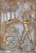David (oder Samson) bekämpft einen Löwen (1 Sam 18,34-36 ). Dies ist eine traditionelle Darstellung des Sieges des Guten über das Böse. |