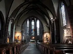 Im Innern gehört die Kanzel von 1495 zu den ältesten erhaltenen Ausstattungsgegenständen. Das Steinmetzzeichen stammt ebenfalls von Hans Meiger von Werde („hh“ = Hans Hammer)[5], der im Straßburger Münster neun Jahre früher ebenfalls die Kanzel geschaffen hat.[6]