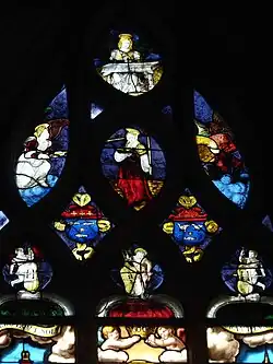 ![]() Das Georgsfenster wurde vermutlich zwischen 1481 und 1483 geschaffen. Damals war der französische König Ludwig XI. Grundherr von La Ferté-Bernard. An ihn und seine Gemahlin Charlotte von Savoyen erinnern die beiden Wappen in den Spitzen der rechten und linken Lanzette. Beide sind auch in der mittleren Lanzette über dem heiligen Georg, der den Drachen besiegt, dargestellt. Die seitlichen Lanzetten schildern Szenen seines Martyriums.[21] |