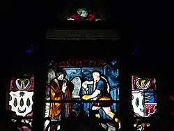 ![]() Das zentrale Chorfenster mit der Darstellung der Beweinung Christi stammt aus dem späten 16. Jahrhundert. Das Maßwerk wurde durch Scheiben aus dem Ende des 15. Jahrhunderts ergänzt, auf denen Gottvater und zwei Engel mit den Leidenswerkzeugen dargestellt sind.[4] |