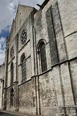 Die Gründung der Kirche Notre-Dame wird auf den französischen König Robert den Frommen (972–1031) zurückgeführt, der wohl um 1022 in der Nähe seines Schlosses ein Stift mit zwölf Kanonikern ansiedelte. Er stattete seine Gründung mit Reliquien der Märtyrer Cantius, Cantianus und Cantianilla aus, die er aus Mailand mitgebracht hatte.[2] Von diesem ersten Kirchenbau ist nur noch die Krypta erhalten. In der ersten Hälfte des 12. Jahrhunderts begann man mit dem Bau der heutigen Kirche. Zwischen 1130 und 1140 wurden das zweijochige Hauptschiff, die Seitenschiffe, das nördliche Querhaus und der Westturm errichtet. Zwischen 1140 und 1150 entstanden der dreijochige, rechtwinklig geschlossene Chor und der trapezförmige Raum zwischen den beiden südlichen, in der zweiten Hälfte des 12. Jahrhunderts angefügten Apsiskapellen, der als Archiv genutzt wurde. In der zweiten Hälfte des 12. Jahrhunderts folgten auch die nördlichen Seitenschiffe des Chors mit ihren Ostapsiden und das südliche Querhaus. Im 13. Jahrhundert wurde eine neue, mit Zinnen bekrönte Westfassade errichtet.