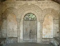 Das überaus schlichte und – im Vergleich zu den anderen Kirchenbauten im Poitou – beinahe archaisch wirkende Portal ist dreigeteilt: Die mittlere Arkade bildet den eigentlichen Eingang; die beiden – etwas niedrigeren – seitlichen Arkaden sind blind. Drei einfache, undekorierte aber schön abgestufte Archivolten bilden den oberen Abschluss; sie ruhen auf vorgelegten Pfeilern (außen) bzw. auf Säulen (innen) – wie im Poitou üblich fehlt ein Tympanon. Bereits in dieser einfachen Form ist das antike Triumphbogenschema erkennbar, welches in der Folge an vielen späteren Kirchenbauten im Poitou und in der Saintonge variiert wird.