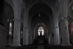 Die Bleiglasfenster stammen aus dem späten 19. und frühen 20. Jahrhundert. Einige der Fenster tragen die Signatur des Glasmalers Hucher und der Glasmalereiwerkstatt der Karmelitinnen von Le Mans. Das Fenster mit der Darstellung von Louis-Ernest Dubois, des Kardinals und Erzbischofs von Paris, trägt die Signatur von Henri-Marcel Magne. Neben dem Kardinal steht sein Schutzpatron, der französische König Ludwig der Heilige, sein Wappen ist im Maßwerk abgebildet.[1]