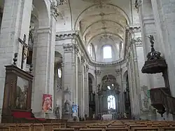 Durch einen Bombenangriff 1940 brannte der Dachstuhl aus, wertvolle Teile der Innenausstattung konnten aber gerettet werden. Die Kirche ist ein typischer Bau des französischen Barock des 17. und 18. Jahrhunderts. Die Fassade ist klassisch aufgebaut. Die mittlere Fassade ist so breit wie jeweils die beiden Turmfassaden. Dieser Dreiteilung entsprechen wiederum die drei etwa gleich hohen Etagen der beiden Türme. Die Aufteilung wird durch Säulen und Gesimse akzentuiert. Die nüchterne Feierlichkeit im Innern geht wohl auf den Einfluss des Jansenismus zurück. Durch die Vierungskuppel und das hohe Querschiff sowie die großen muschelförmigen Fenster wirkt sie majestätisch und hell.