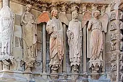 Rechtes Gewände: Das linke Paar stellt die Verkündigung dar, die rechte Zweiergruppe ist die sog. Heimsuchung, also die Zusammenkunft der beiden ein Kind erwartenden Frauen Maria und Elisabeth.[30] Besonders das Gesicht der Maria, der zweiten Figur von rechts, hat die Klarheit, den Adel und die Großflächigkeit antiker Frauengestalten.[31] Auch die Behandlung der Gewänder erinnert eher an griechisch-römische Skulpturen als die traditionelleren Figuren auf der linken Seite des Gewändes. Die Figuren wurden in den frühen 1230er Jahren für ein anders geplantes Portal an der später abgerissenen Westfassade angefertigt, aber erst um die Mitte des Jahrhunderts, dem Baufortschritt entsprechend, an die neue Westanlage versetzt.