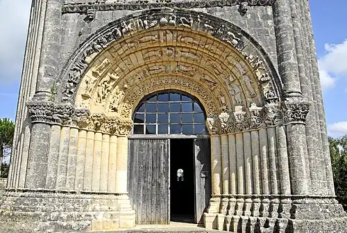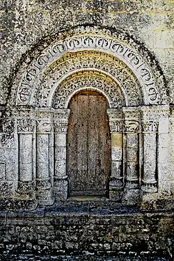 Das große Archivoltenportal besteht aus fünf Archivoltenbögen, die beidseitig auf neun halbrunden Diensten stehen. Je ein Archivoltenbogen wird auf jeder Seite von zwei Säulen getragen. Die äußeren Dienste sind dicker als die anderen. Die Kapitelle und die breiten Kämpferprofile sind überwiegend pflanzlich dekoriert. Lediglich die äußeren und inneren Kapitelle sind figural ornamentiert, teilweise mit Körpern von Vögeln, mit schlangenartigen Hälsen und menschlichen Gesichtern.