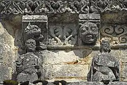 Die Wand des Obergeschosses der Fassade tritt deutlich zurück, bis etwa in die gleiche Tiefe, wie die innere Archivolte. Auf beiden Seiten des Obergeschosses befinden sich hinter den das Archivoltenfeld begrenzenden Halbsäulen strebepfeilerartige Wandstücke, im Grundriss um 45 Grad nach innen abgewinkelt. Der untere Teil des Obergeschosses ist eine Art Skulpturenfries, der oberseitig von einem stark ausladenden, profilierten und üppig pflanzlich dekorierten Kraggesims begrenzt wird. Das Gesims wird von zehn Kragsteinen getragen, die mit Porträts von Menschen und Tieren der realen und Fantasiewelt gestaltet sind, in höchster Qualität romanischer Steinmetzkunst. Die Zwischenräume der Kragsteinen sind mit rechteckigen Steinen ausgefüllt, die je ein eigenständiges pflanzliches Ornament tragen.