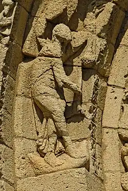 - Links der Mitte: Die spärlichen Reste des Lasters lassen durch die Form des rundlichen Kopfes und die einer nach unten ausgestreckten Hand auf eine menschliche Gestalt schließen. Die Tugend hebt den linken Arm und greift mit der Hand etwas undefinierbares und verschwundenes.