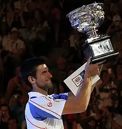 Der topgesetzte Serbe schlug im Finale der Australian Open Andy Murray mit 6:7, 7:6, 6:3 und 6:2 und sicherte sich damit, zusammen mit einem Preisgeld von 2,43 Millionen US-Dollar, seinen insgesamt vierten Titel beim ersten Grand-Slam-Turnier des Jahres. Außerdem war er damit der erste Spieler der Open Era, der bei den Australian Open dreimal in Folge gewann.[11] In der ersten Runde des Davis Cups gegen Belgien kam Đoković im Einzel gegen Olivier Rochus zum Einsatz, den er klar in drei Sätzen besiegte. Serbien gewann die Partie mit 3:2. In Dubai besiegte Đoković Tomáš Berdych in 94 Minuten mit 7:5 und 6:3. Es war sein vierter Titel bei diesem Turnier. Bei den Masters in Indian Wells und Miami erreichte er das Halbfinale bzw. Achtelfinale. In der zweiten Runde des Davis Cups führte er die serbische Mannschaft gegen die Vereinigten Staaten an. Er gewann seine beiden Einzel gegen John Isner und Sam Querrey, die Begegnung endete mit 3:1 für Serbien.
