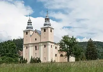 - Die Filialkirche „Mariä Himmelfahrt“ wurde ab 1702 nach Plänen des Glatzer Festungsbaumeisters Jakob Carove vom Baumeister Rotter und dem Wölfelsdorfer Zimmermann J. Knietig errichtet und erst 1751 fertiggestellt. Die Wandmalereien stammen von dem Wölfelsdorfer Maler Joseph Bartsch. Den architektonischen Hauptaltar schuf 1793 Michael Klahr d. J., der 1794 auch die Kanzel lieferte. Sie ist an der Brüstung mit den Evangelistenfiguren und in der Bekrönung mit Gott Vater geschmückt. Die Seitenaltäre werden ebenfalls Michael Klahr zugeschrieben. Der Doppelturm wurde 1805 fertiggestellt.