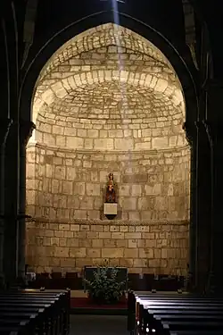 Zur Apsis öffnet sich ein leicht gebrochener Bogen, der auf wuchtigen Pfeilern mit Halbsäulen aufliegt. Auf den Kapitellen sind der Sündenfall von Adam und Eva zu sehen und eine Verkündigungsszene. Die Darstellung einer Frau, der von einer Kröte und einer Schlange die Brüste abgebissen werden, symbolisiert die Unzucht. Eine Person, um deren Hals ein dicker Beutel hängt, an dem Teufel ziehen, soll den Geiz verkörpern.