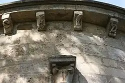 Das Dach der Apsis ruht auf Steinplatten, die auf Kragsteinen mit skulptierten Tierdarstellungen, Pflanzenmotiven oder geometrischen Figuren aufliegen.