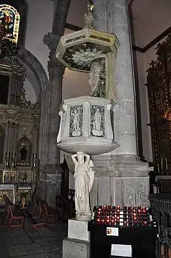 Die Kanzel befindet sich zwischen dem linken Seitenschiff und dem Hauptschiff an einem der Säulenbündel, das die Kuppel trägt. Sie wurde in derselben Werkstatt und gleichzeitig mit dem Tabernakel aus gemasertem Marmor angefertigt. Der Kanzelkörper wird von einem Karyatidenengel getragen. Der Schalldeckel und das Relief des Heiligen Geistes stammen aus dem Jahr 1915.