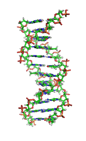Die Paare der Stickstoff (blau) enthaltenden Nukleinbasen stellen hier quer liegende Verbindungen zwischen den beiden längs verlaufenden Strängen dar (Kohlenstoff grün), deren Rückgrat reich an Sauerstoff (rot) ist.