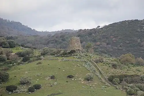 Der bis in eine Höhe von 12,6 m erhaltene Hauptturm aus Granit ist eine Besonderheit unter den Nuraghen, da zwei Stockwerke vollständig erhalten sind. Er hat übereinanderliegende Kragkuppeln im Erdgeschoss und im ersten Stock. Der Grundriss ist in allen Elementen der eines klassischen Tholosnuraghen, mit linksgängiger steiler Treppe und Wächterzelle im Durchgang. Die Wächterzelle mit einem kleinen Vorflur ist hakenförmig. Die ebenerdige zentrale Kammer hat einen runden Grundriss und drei auf den Achsen angeordnete Seitennischen. Die dem Zugang gegenüberliegende ungewöhnlich lange Hauptnische hat einen T-förmigen Appendix. Die rechte Zelle ist deutlich höher als die beiden anderen.