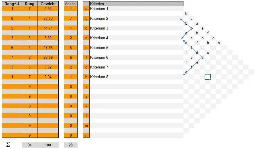 Während das Direct Ranking für die Gewichtung weniger Kriterien durchaus geeignet sein kann, sollte bei einer Vielzahl von Kriterien auf Methoden gesetzt werden, die einen paarweisen Vergleich durchführen. Eine Methode dafür ist die Präferenzanalyse. Hierbei werden alle Kriterien nacheinander miteinander verglichen und es wird ausgewählt, welches Kriterium oder Ziel wichtiger ist. Untenstehende Grafik zeigt eine Möglichkeit mit einer Tabellenkalkulation einen paarweisen Vergleich durchzuführen. Die Pfeile in der Abbildung zeigen, welche Kriterien miteinander verglichen wurden. Der Buchstabe des bevorzugten Kriteriums wird in die Tabelle eingetragen. Anschließend werden die Ränge und die umgekehrten Ränge (umgedreht geordnet) anhand der absoluten Anzahl der Nennung („Anzahl“ in der Tabelle) ermittelt. Danach wird das Gewicht jedes Kriteriums ermittelt, indem die Summe der Gewichte (100) durch die Summe der vergebenen Ränge (34) geteilt und anschließend mit dem umgekehrten Rang multipliziert wird. Formal ausgedrückt lautet die Berechnung:[10]