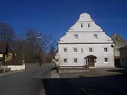 - Ehemaliges Gerichtsgebäude, später Bauernhaus mit geschweiftem barockem Südgiebel und Marienfigur in der Fassadennische