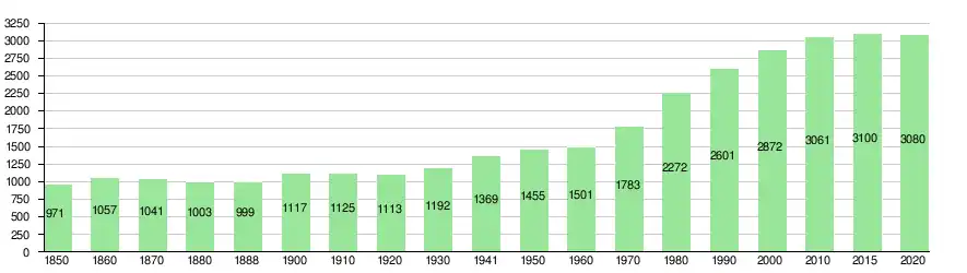 Bevölkerungsentwicklung von Oberdorf seit 1850 Quelle: Volkszählungen (1850–2000 Eidgenössische), Bundesamt für Statistik (ab 2010)