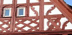 Der Grundriss ist wie damals üblich einmal längs und zweimal quer geteilt. Der obere Fachwerkstock und die drei Dachstöcke kragen jeweils vor. Das Satteldach ist mit Biberschwänzen gedeckt. Die Zierformen des Straßengiebels sind besonders zahlreich in den Dachstöcken mit Andreaskreuzen über liegenden Rauten bzw. über Kreisen. An den Fachwerkstöcken sehen wir Kopfwinkelknaggen beim Fränkischen Mann mit vertieften Augen und Kreissegmenten. Alle Stockwerke haben geschweifte Streben mit Nasen.