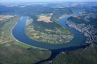 Der Rhein von unterhalb der Mündung der Lahn bei Lahnstein bis zur Mündung der Mosel am Deutschen Eck in Koblenz gehört nach der streng naturräumlichen Ordnung bereits zur Neuwieder Rheintalweitung (291.0) als Zentrum des Neuwieder Beckens und damit zum Mittelrheinischen Becken (291).[3][14] Er ist indes explizit als Bestandteil des Weltkulturerbes aufgeführt. Dieses ist auch insofern nicht unlogisch, als das Moseltal und das Gießen-Koblenzer Lahntal die links- und rechtsrheinischen Fortsetzungen ein und derselben Talsenke darstellen.