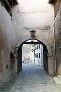 Der Torturm stammt aus dem späten 14. Jahrhundert[1] und ist sehr gut erhalten; es fehlt nur der frühneuzeitliche Zwinger des Vorwerks. Das Tor wurde 1615 mit dem Anbau des Vorwerks erneuert. Ein kleines Wohnhaus als zweigeschossiger Pultdachbau wurde im 18. oder 19. Jahrhundert angebaut und modern erweitert. An der Nordwestseite verläuft die Stadtmauer.[1]