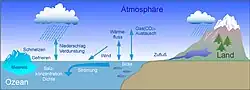 Durch den Austausch von Energie und Materie übt der Ozean eine wichtige Kontrolle über die physikalischen und chemischen Eigenschaften der Atmosphäre aus und wird seinerseits durch atmosphärische Prozesse beeinflusst. Die Wechselwirkung Ozean – Atmosphäre ist daher ein wichtiger Bestandteil des Erdsystems. Die Wechselwirkungen sind komplex und umfassen den Austausch von Wärme, Feuchtigkeit und Gasen. Der Wind spielt eine entscheidende Rolle bei der Erzeugung von Oberflächenwellen und der Durchmischung der oberen Wasserschichten. Diese Durchmischung, auch als Windmischung bezeichnet, beeinflusst die vertikale Verteilung von Temperatur und Salzgehalt und trägt zur Bildung von Oberflächenströmungen bei.[14]