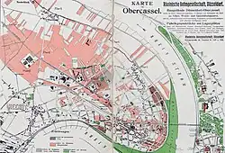Die Rheinische Bahngesellschaft errichtete einen neuen, starken Deich und durchzog Oberkassel mit einem Netz von Ring-, Radial- und Diagonalstraßen. Die Entwicklung von Grundstücken entlang der neuen Bahntrasse war zur Finanzierung des Bahnbaus vorgesehen. Die Konzeption des neuen Stadtteils oblag dabei dem Stadtplaner Josef Stübben. So entstand in den Jahren zwischen 1900 und 1914 ein in geschlossenem Blocksystem bebautes Wohngebiet mit qualitätsvollen Gründerzeithäusern der mittelständischen und gehobenen Schichten. Bis zum Ersten Weltkrieg war unter anderen Theodor Balzer, Adam Dickmann, Heinrich Fedler, Oskar Rosendahl[8], Carl Schaumburg (1867–1940) und Gustav Utermann einer der wichtigsten Architekten für Oberkassel. Durchschnittlich wurden in jedem Jahr hundert neue Häuser gebaut und die Einwohnerzahl stieg von 4400 im Jahr 1895 auf 11.400 im Jahr 1907. Am 1. April 1909 wurde Oberkassel gemeinsam mit den anderen Orten der alten Landgemeinde Heerdt, Niederkassel, Lörick und Heerdt nach Düsseldorf eingemeindet.
