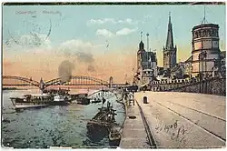 Die erste Oberkasseler Brücke wurde 1896 bis 1898 im Auftrag der Rheinischen Bahngesellschaft AG und auf Initiative und durch Finanzierung der Rheinbahngründer Heinrich Lueg, Franz Haniel junior, Friedrich Vohwinkel und August Bagel „der Jüngere“ als Teil der K-Bahn gebaut und am 12. November 1898 eröffnet.[7] Ihre beiden großen Eisenfachwerkbögen mit jeweils rund 181 Metern Spannweite und die vier kürzeren Bögen über der Düsseldorfer Rheinwerft und dem flachen Oberkasseler Ufer wurden durch den Ingenieur Reinhold Krohn geplant und von der Gutehoffnungshütte in (Oberhausen-) Sterkrade ausgeführt. Die beiden historistischen Tortürme und die Aufbauten des Mittelpfeilers mit der Figur des rheinaufwärts blickenden Bergischen Löwen sowie das Brückengeländer hatte der Düsseldorfer Architekt und Maler Adolf Schill entworfen, seit 1880 Professor für Dekoration und Ornamentik an der Kunstakademie Düsseldorf.[8] Die Portale waren nicht nur wichtige Blickpunkte der Luegallee und des ungefähr parallel zum Brückenbau vorgeschobenen Rheinufers, sondern gleichzeitig auch Stationen zur Entrichtung der anfänglich erhobenen Brückenmaut. Alle massiven Bauteile wurden durch die Bauunternehmung Philipp Holzmann & Cie. GmbH ausgeführt. Die Baukosten betrugen rund sechs Millionen Mark. Um auf dem östlichen Rheinufer das Portal und die Brückenauffahrt anlegen zu können, wurde der dort gelegene Sicherheitshafen zugeschüttet. Dies konnte geschehen, weil am 30. Mai 1896 erste Anlagen des heutigen Hafens an der Lausward eröffnet worden waren.