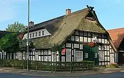 - Nr. 8: 1-gesch. Bauernhaus von um 1720, ein reetgedecktes, niederdeutsches 2-Ständer-Fachwerkhaus mit Krüppelwalm als Gaststätte Meyer am Boom (am Schlagbaum der nahen Grenze), schon damals mit Schankbetrieb.