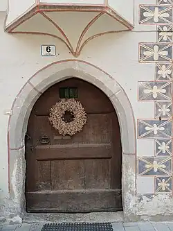 Dieses Haus zeigt sich in seinem nördlichen Bauteil und im ersten Stock in um 1900 erneuerter Form. An der Fassade befindet sich über dem Rundbogentor ein Balkon mit Eisengitter. Im südlichen Teil des Erdgeschosses sind Kreuzgratgewölbe erhalten.