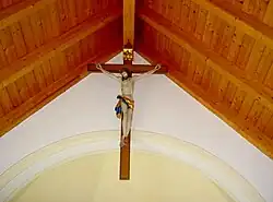 Die Kirche ist ein schlichter Rechteckbau mit einem überdachten Portikus, einer runden Apsis und einem als Glockenturm genutzten Dachreiter. Seit 1960 befindet sich dort eine umgegossene Glocke (die ursprüngliche Wetterglocke stammte von 1439), damals wurde auch ein elektrisches Geläut eingebaut. Die Holzdecke stammt aus dem Jahr 1930, ein neues Gestühl wurde 1978 eingerichtet. Auf dem Marienaltar steht eine spätgotische Holzstatue der Madonna mit dem Kind aus dem Jahr 1480. Über dem Eingang hängt ein großes hölzernes Kruzifix. Die Kreuzwegbilder und der wuchtige Opferstock wurden neu angeschafft.[13][14]