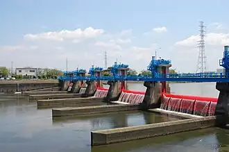 Der Kamegawa-Damm wurde nahe dem Kazusa-Kameyama Bahnhof der Kururi-Bahnstrecke der JR East am Oberlauf des Flusses im Jahr 1979 errichtet. Dieser Damm bildet den Kameyama-Stausee, welcher das größte Wasserreservoir der Präfektur Chiba mit einem Durchmesser von 35 km darstellt.[3]