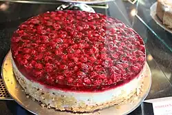 Eine weitere Möglichkeit ist die Verwendung von Früchten, Fruchtmus oder Obststücken, die in Sahnetorten oder Cremetorten eingearbeitet sind. Im Allgemeinen spricht man dann von Frucht-Sahne-Torte oder Frucht-Creme-Torte. Eine beliebte Variante ist die Quark-Sahne-Torte (auch Käse-Sahne-Torte), die mit Früchten, beispielsweise Erdbeeren, Himbeeren, Johannisbeeren oder Pfirsichstücken verfeinert werden kann.[1][2]