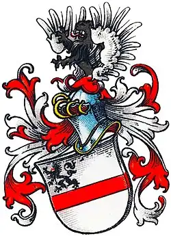 Blasonierung: In Silber ein roter Balken, im rechten Obereck ein schwarzer rechtsspringender Löwe. Auf dem Helm mit rot-silbernen Helmdecken der Löwe wachsend zwischen einem geschlossenen silbernen Flug.[1]