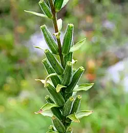 Die junge Frucht ist mit Drüsenhaaren und spitzen Haaren bedeckt.[1] Die sitzende, lokulizide Kapselfrucht ist bei einer Länge von 2 bis 4 Zentimeter und einem Durchmesser von 4 bis 6 Millimeter zylindrisch und mehr oder weniger gerade.[3] Die Samen stehen in zwei Reihen je Fruchtfach. Die 1,1 bis 2 Millimeter großen, kantigen[3] Samen besitzen eine braune bis fast schwarze und unregelmäßig genarbte Oberfläche.[2]