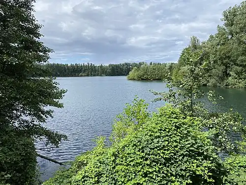 „eine ehemalige Kiesabgrabung mit sehr klarem Wasser. Die Unterwasservegetation ist mit Rasen von Armleuchteralgen und submersen Wasserpflanzen gut ausgebildet. Im Süden sind lokal auch Schwimmblattpflanzen vorhanden. Die älteren Steilufer im Süden, Westen und Osten sind mit Pappeln, Erlen und Weiden bestanden. Im Osten sind große Uferbereiche als periodisch trockenfallende Flachwasserzonen durch kleine Wälle vom Rest des Sees abgegrenzt, an deren Rändern sich Röhricht und Hochstaudenfluren entwickelt haben. Daran schließt sich eine größere, sandig-kiesige gehölzarme Fläche mit Pionier- und Trockenrasen-Elementen sowie einem Kleingewässer an. Der Bereich wird regelmäßig freigestellt. Die westlich an den See angrenzenden Waldflächen sind mit Ahorn- und Fichten-Mischwald bestanden. Das Gelände ist vollständig eingezäunt. Für Zweidrittel des Ufers besteht ein Betretungs- und Angelverbot. Das Gewässer darf nicht mit Booten befahren werden. Am Nordufer sind einige Anglerstege vorhanden. Das Gewässer ist aufgrund der gutem Wasserqualität und der gut ausgebildeten Unterwasservegetation mit Armleuchteralgen ein Natura-2000-Lebensraumtyp der oligo- bis mesotrophen kalkhaltigen Stillgewässer. An Flachwasserbereichen im Osten kommt lokal der Sechsmännige Tännel vor, der für die Niederrheinische Bucht in der Roten Liste 2010 als verschollen und für NRW als stark gefährdet verzeichnet ist. Dem See kommt als störungsarmer Brut- und Überwinterungsbiotop für seltene Wasservogelarten wie Kormoran, Haubentaucher, Tafel- , Schnatter- und Reiherente eine große Bedeutung zu. Im Winter nutzen Gänse und Zwergsäger sowie Schellenten das Gewässer. Die Flachwasserzonen und Kleingewässer sind für Amphibien von großer Bedeutung und eine potentieller Lebensraum für die seltene Kreuzkröte. Die offenen Sand- und Kiesflächen sind ein potentieller Lebensraum für die gefährdete Zauneidechse. Das Gebiet ist Teil des Biotopverbundes mehrerer Abgrabungsgewässer und ein Trittsteinbiotop in der Vernetzung lokaler Populationen sowie als Rast- und Ausweichhabitat für durchziehende und überwinternde Wasservögel. Hauptentwicklungsziel ist das Offenhalten der kiesig-sandigen Böschungen, Ufer- und Flachwasserbereiche. Die nicht standortgerechten Gehölze sollen durch heimische Gehölze ersetzt werden.“