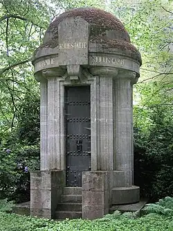 Es entwickelte sich ein Grabkult, der im Kontext stand mit der zeitgenössischen Denkmalbegeisterung, Architekten wurden mit der Schaffung exklusiver Grabbauten beauftragt, repräsentative Grabkapellen, Mausoleen und Säulenhallen geschaffen. Insbesondere das Gelände am Nordteich und der waldartig bepflanzte nördliche Bereich wurden mit teilweise großflächigen Familienanlagen oder imposanten Bauwerken belegt und ausgeschmückt mit Statuen, Plastiken, Grabmalwänden, Pflanzenarrangements, Mauern und Treppchen. Unter den namhaften Künstlern, die diese Werke schufen, befanden sich unter anderem Xaver Arnold, Ernst Barlach, Arthur Bock, Hans Dammann, Martin Haller, Richard Kuöhl, Hugo Lederer, Albert Leistner, Richard Luksch, Gerhard Marcks, Hermann Perl, Heinrich Pohlmann, Hans Martin Ruwoldt, Fritz Schumacher, Stephan Sinding, Oskar Ulmer, Heinrich Wefing, Oskar Witt.[25][26] Mit dieser Grabart „wurde das neue Ideal der Bestattung an einem lieblichen Ort inmitten der Natur umgesetzt, auf dem zudem noch die bürgerliche Privatsphäre gewahrt blieb.“[27]