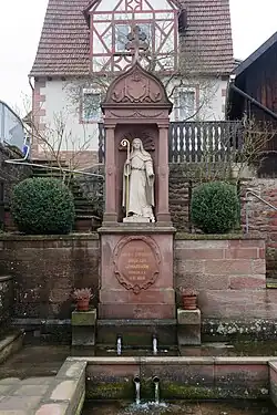 Unterirdisch zieht er dann an einem zweigeschossigen Satteldachhaus vorbei, dessen massives Erdgeschoss und Fachwerkobergeschoss über einem älteren Keller errichtet wurden und dekorative Bauteile des 17./18. Jahrhunderts einbeziehen.[12] Anschließend kreuzt er die Lindenstraße, passiert den Oberen Brunnen und setzt seinen Weg fort, zwischen dem Brunnenpfad links und der Flörstraße rechts, am Ottilienbrunnen vorbei, einem 1908 errichteten Sandsteinbrunnen mit Ädikulagehäuse, geschweiftem Giebel, Kreuzbekrönung und Steinskulptur der heiligen Ottilia.[13] Etwas nördlich davon steht die katholische Pfarrkirche St. Ottilia, deren Chor 1711/12 errichtet wurde; während das Langhaus auf mittelalterliche Bauteile zurückgreift und 1825 einen Dachreiter erhielt.[14] Um die Kirche gruppieren sich drei giebelständige, denkmalgeschützte Fachwerkhäuser.