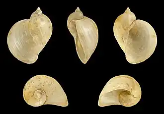 Das relativ dünnschalige Gehäuse ist ohrförmig, wobei die ersten beiden, sehr kleinen Umgänge kaum an Breite zunehmen; der letzte Umgang ist dagegen sehr stark verbreitert. Dadurch entsteht eine konkave Außenlinie am Gehäuse. Das Gehäuse misst etwa 1,5 bis 2,5 cm in der Höhe und bis fast 2 cm in der Breite. Am Innenrand der Öffnung ist eine kräftige Falte entwickelt, die in der Mitte eingedellt bzw. etwas verdreht ist. Die Gehäuse weisen aber eine hohe intraspezifische Variabilität auf. Der Körper des Tieres ist im vorderen Teil eher hell mit dunklen Flecken, im hinteren Teil eher dunkel mit helleren Flecken. Die Fühler sind dreieckig mit den Augen an der Basis der Fühler.