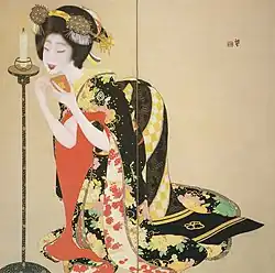 - ↑ Teiten (帝展) ist die Abkürzung für die jährliche staatliche Kunstausstellung (帝国美術展覧会, Teikoku bijutsu-in tenrankai) zwischen 1919 und 1935. Die Vorgängerin von 1907 bis 1918 hieß Bunten (文展) für Mombushō bijutsu tenrankai (文部省美術展覧会), die Nachfolgerin von 1936 bis 1944 wurde ein Shin (新) für „Neu“ vorgesetzt. Die Nachfolgerin ab 1946, nun nicht mehr staatlich, hieß kurz Nitten für (日本美術展覧会, Nihon bijutsu-in tenrankai).