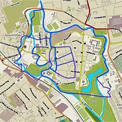 Lageplan des Okerverlaufs heute (2015) und schraffiert dunkelblau der Verlauf von 1741 (ohne Festungsgräben vor den Bastionen).