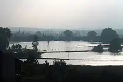 Die Okeraue nördlich von Wolfenbüttel bei Hochwasser, Blickrichtung Stadtkern 2007.