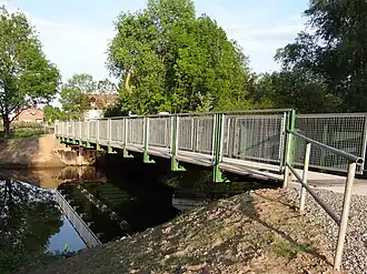 Die im 20. Jahrhundert dort vorhandene Okerbrücke wurde zum Ende des Zweiten Weltkriegs am 11. April 1945 von deutschen Soldaten gesprengt[4] und später neu aufgebaut. Im Zuge der Okerregulierung wurde 1963 über den nun umgeleiteten und begradigten Fluss eine Holzbrücke mit eingeschränkter Tragfähigkeit errichtet. Sie hatte zwei Pfeilerreihen im Fluss sowie zwei Eisabweiser. Sie verfügte über eine ausreichende Breite für zwei Pkws sowie einen schmalen Fußweg. Am tragenden Holz wurde 2011 ein Pilzbefall diagnostiziert, so dass die Brücke ab Oktober 2011 für Kraftfahrzeuge gesperrt und 2012 abgerissen werden musste. An ihre Stelle trat im Mai 2012 eine stählerne Behelfsbrücke, die von der Stadt Braunschweig gemietet wurde. Diese wurde Ende August 2015 beseitigt. An den Widerlagern der alten Okerquerung sind noch Spundwände und Reste der Holzpfosten deutlich und absichtlich sichtbar.