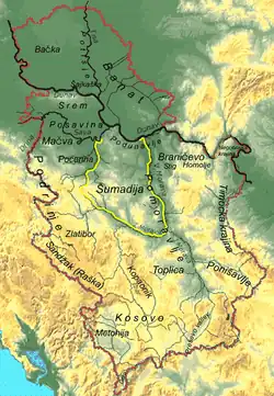 Die historische Region Šumadija ist größer als der Bezirk Šumadija und schließt weite Gebiete der Nachbarbezirke mit ein. Die Region umfasst ungefähr das Gebiet zwischen den Flüssen Donau, Save, Große Morava, Westliche Morava (einer der Quellflüsse der Großen Morava) und Kolubara. Die Grenzen der Region sind nicht klar definiert.
