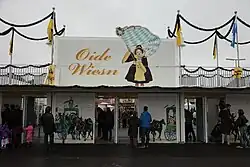 Anlässlich des 200-jährigen Jubiläums wurde 2010 erstmals am Südende der Theresienwiese ein historisches Oktoberfest („Oide Wiesn“) auf dem Areal des zentralen Landwirtschaftsfestes gestaltet. Es eröffnete einen Tag vor Beginn des eigentlichen Oktoberfestes gleichfalls mit dem Fassanstich durch den Oberbürgermeister. Auf dem fünf Hektar umfassenden abgezäunten Gelände präsentierten sich historische Fahrgeschäfte, Festzelte und andere historische Attraktionen wie das Humoristische Velodrom eine Steckerlfischbraterei, ein Kettenkarussell oder ein Zuckerwattestand. Gegen Eintritt können neben dem Museums- ein Tierzelt sowie die Pferderennbahn besichtigt werden. Das Tierzelt beinhaltet unter anderem einen Streichelzoo und wird vom Tierpark Hellabrunn sowie dem Bayerischen Bauernverband betreut. Das Münchner Stadtmuseum übernahm die Gestaltung des Museumszeltes.[34] Begleitet wurde die Jubiläumswiesn von einem künstlerischen und kulturellen Rahmenprogramm, in dem beispielsweise die Biermösl Blosn auftrat. Die Musikkapellen im Herzkasperl Festzelt – mit 850 vergleichsweise kleinen Sitzplätzen[35] – kamen ohne Lautsprecheranlage aus.[36] Namensgebend für das Festzelt war eine bekannte Bühnenfigur des 2009 verstorbenen Schauspielers Jörg Hube.[37] Die sechs Münchner Brauereien Augustiner, Hacker-Pschorr, Hofbräu, Löwenbräu, Paulaner und Spaten präsentierten ausschließlich hier ein gemeinsam gebrautes, dunkles Spezialbier, das nach einer historischen Rezeptur vom Beginn des 19. Jahrhunderts hergestellt wurde. Die Maßkrüge in den Festzelten trugen demgemäß die Aufschrift Münchner Bier und nicht das Unternehmenslogo einer einzelnen Brauerei. Im Gegensatz zum restlichen Oktoberfest schloss die „Oide Wiesn“ bereits um 20 Uhr. Statt der von der Stadtverwaltung erwarteten 300.000 Gäste kamen weit mehr als eine halbe Million Besucher.[38] Das Gelände musste mehrfach, wie sonst nur Bierzelte, wegen Überfüllung vorübergehend geschlossen werden.